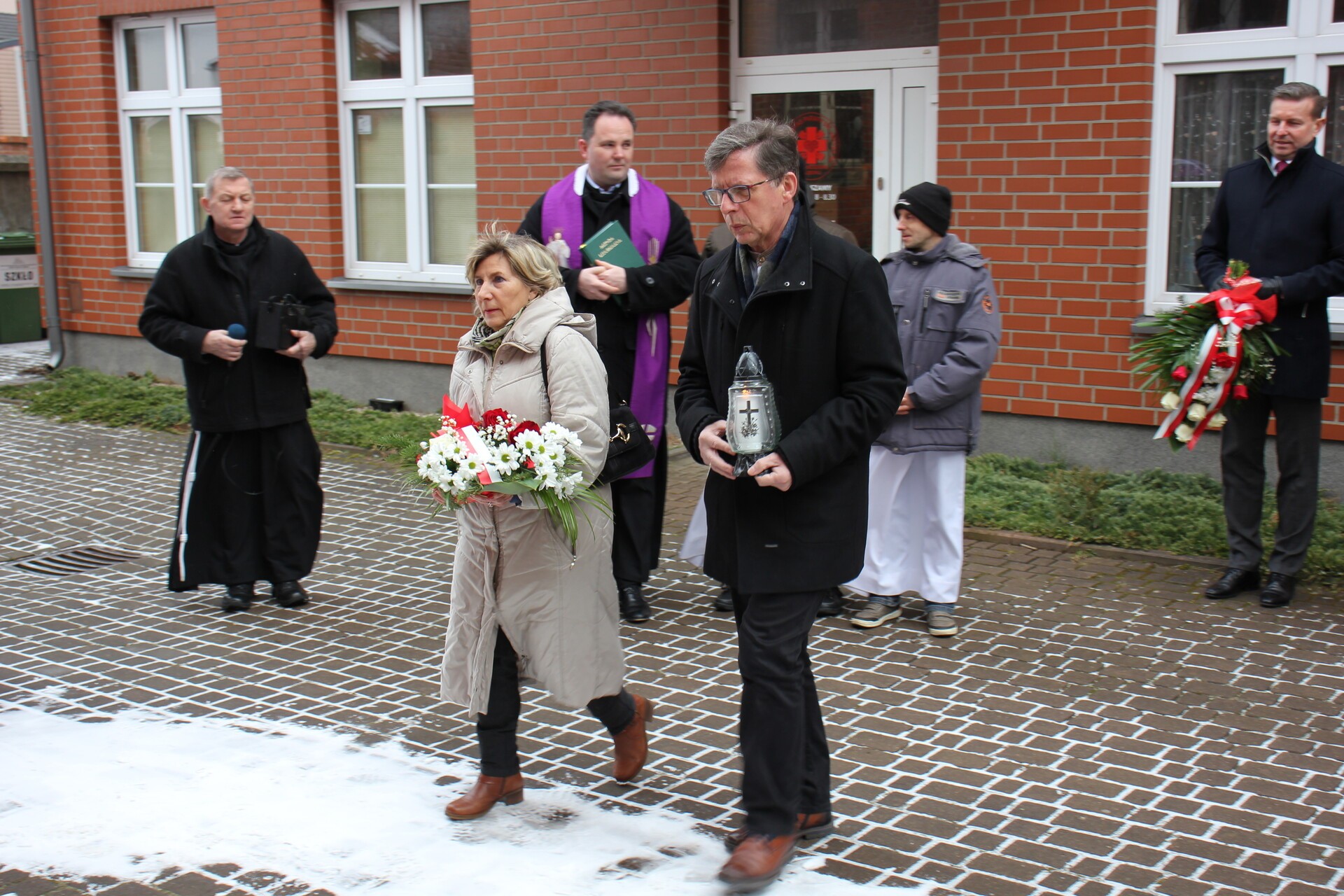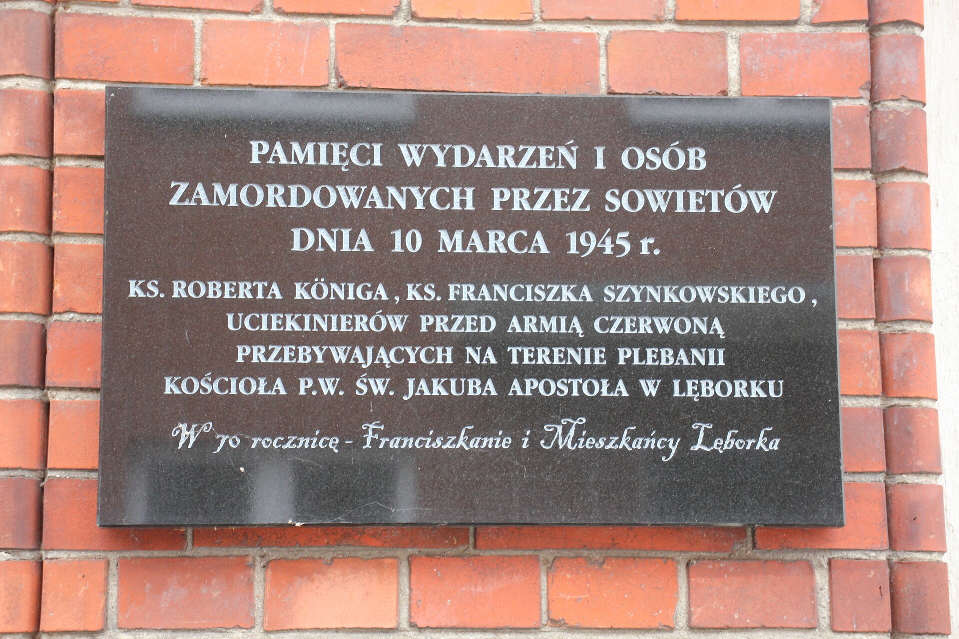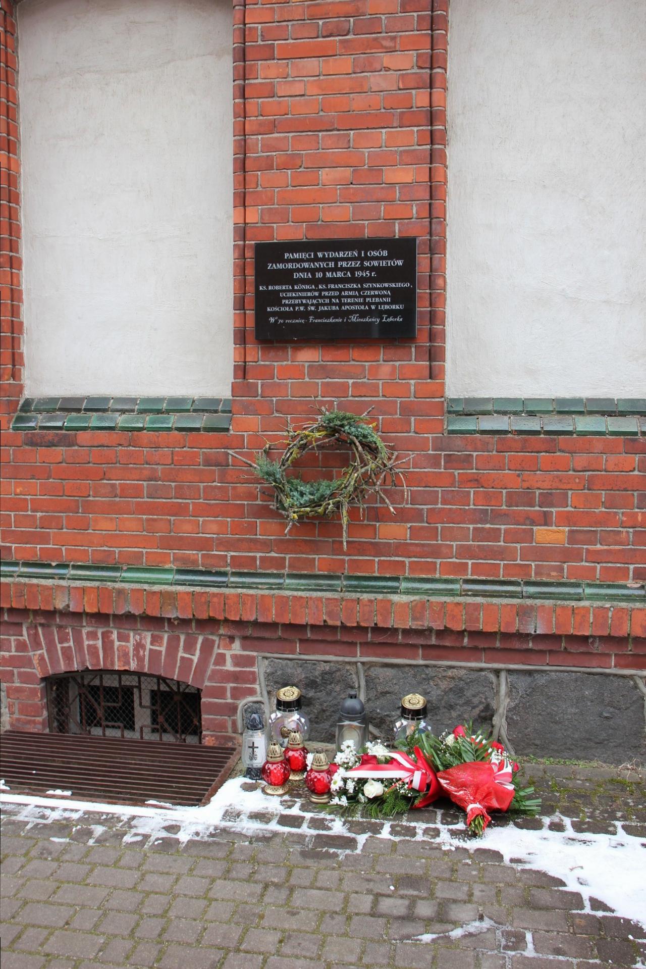 Po mszy i krótkiej modlitwie pod umieszczoną na klasztorze tablicy „Pamięci wydarzeń i osób zamordowanych przez Sowietów 10 marca 1945: ks. Roberta Königa, ks. Franciszka Szynkowskiego, uciekinierów przed Armią Czerwoną przebywających na terenie plebanii kościoła” złożono kwiaty i zapalono znicze. W imieniu samorządu Lęborka kwiaty złożyli sekretarz miasta Marian Kurzydło i radny miejski Zbigniew Rudyk. Powiat Lęborski reprezentował członek zarządu Ryszard Wenta i sekretarz powiatu Danuta Mikołajczyk
