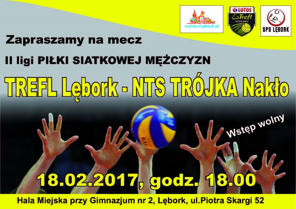Zapraszamy na mecz piłki siatkowej mężczyzn II ligi TREFL Lębork – NTS Trójka Nakło. Spotkanie w Miejskiej Hali Sportowej przy ul. P. Skargi 52 rozegrane zostanie 18 lutego 2017r. o godz. 18.