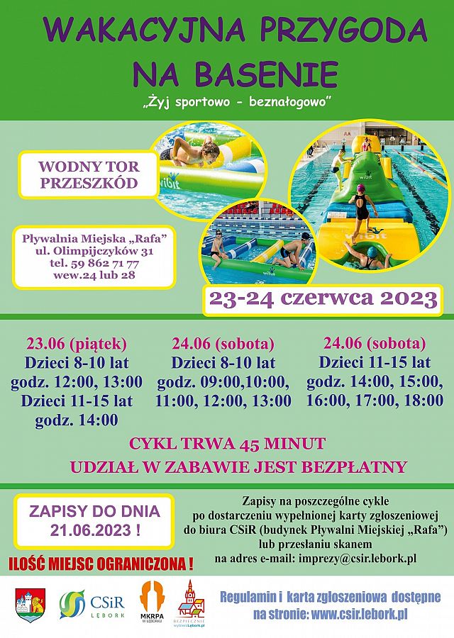 Burmistrz Miasta Lęborka, Centrum Sportu i Rekreacji oraz drużyna WOPR przy CSiR serdecznie zapraszają dzieci i młodzież do wspólnej zabawy na basenie. Zabawy na Wodnym Torze Przeszkód odbędą się 23 i 24 czerwca 2023 r. na Pływalni Miejskiej "Rafa" przy ul. Olimpijczyków 31 w Lęborku. Udział z zabawach dzieci jest nieodpłatny.