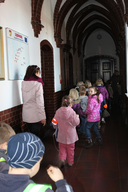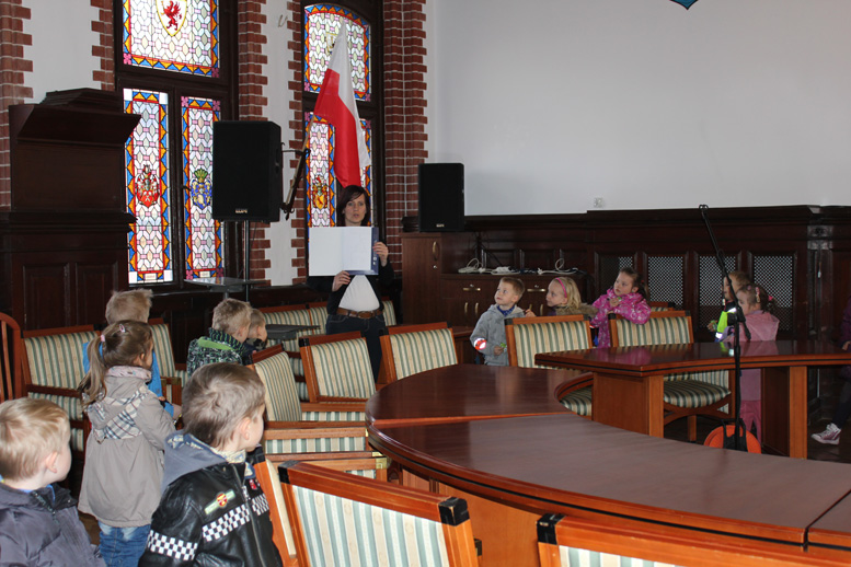 Przedszkolaki obejrzały także salę Rajców. Zapoznały się z wizerunkiem i kolorystyką herbu Lęborka i otrzymały kolorowanki z rysunkiem herbu do pomalowania w przedszkolu.