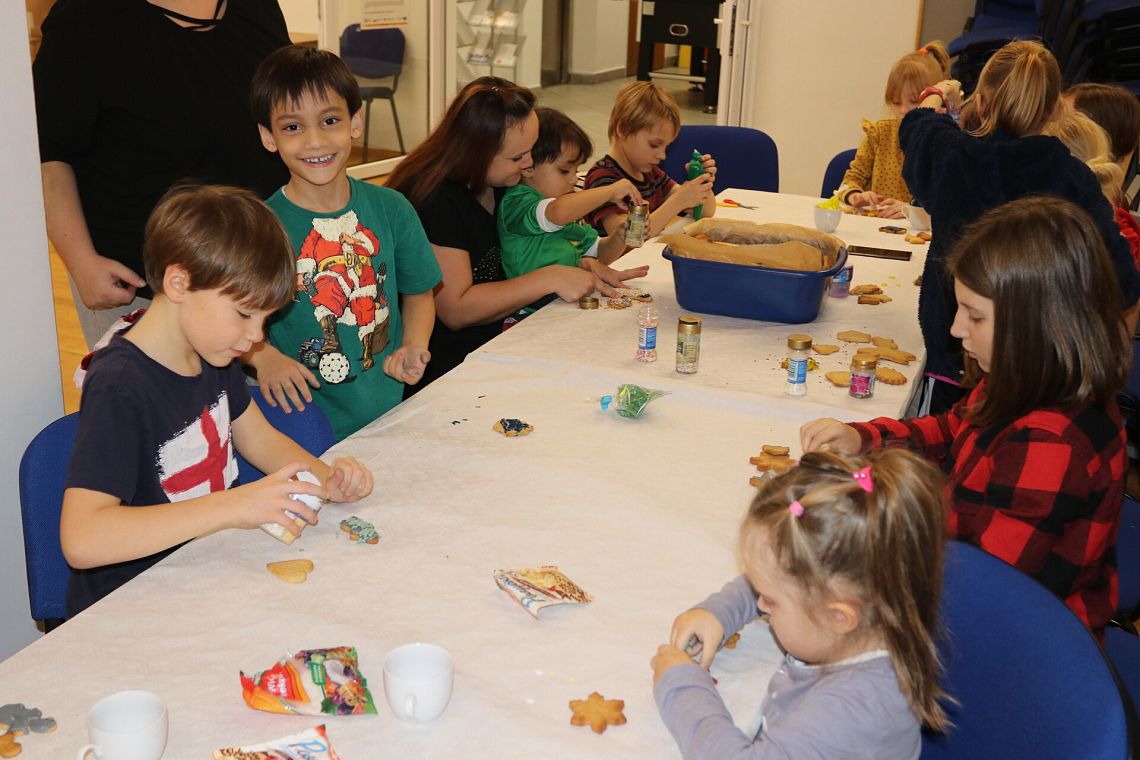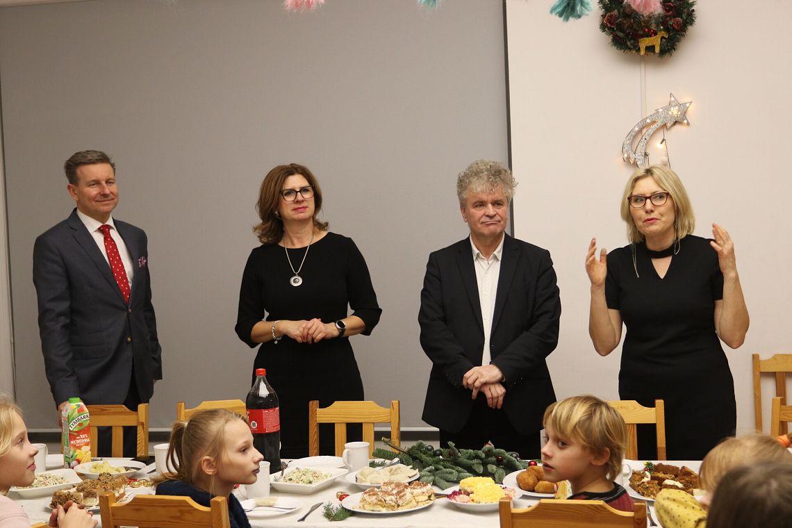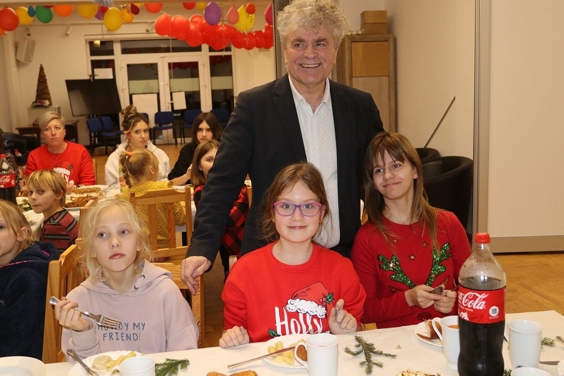 Świąteczny nastrój zapanował 19 grudnia w Klubie Osiedlowym „BAZA”. Jak co roku Burmistrz Miasta - Witold Namyślak, Sekretarz Miasta – Marian Kurzydło, Kierownik Miejskiego Ośrodka Pomocy Społecznej – Elżbieta Michalska wraz z dziećmi pod opieką rodziców oraz Streetwokera spotkali się na wspólnej Wigilii.