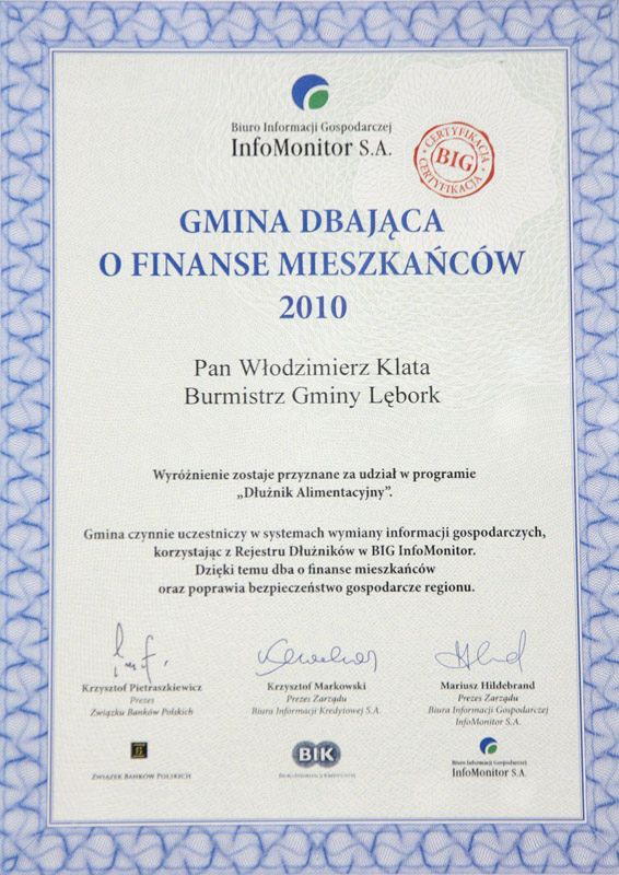 Miasto Lębork otrzymało wyróżnienie-certyfikat „Gmina dbająca o finanse mieszkańców 2010" , przyznane przez Biuro Informacji Kredytowej S.A., Związek Banków Polskich i Biuro Informacji Gospodarczej InfoMonitor S.A. za udział w programie "Dłużnik Alimentacyjny" oraz działania zmierzające do odzyskania należności poprzez wykorzystywanie systemu wymiany informacji gospodarczej.