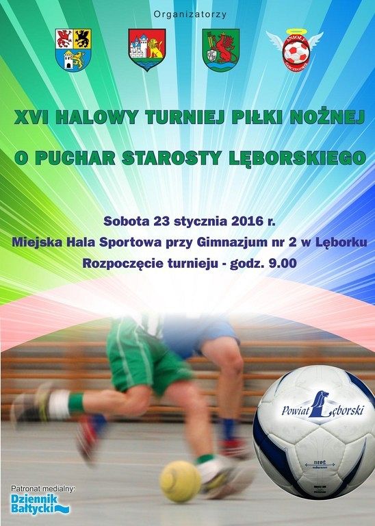 W sobotę 23 stycznia 2016 w Miejskiej Hali Sportowej przy Gimnazjum nr 2 w Lęborku rozegrany zostanie XVI Halowy Turniej Piłki Nożnej o Puchar Starosty Lęborskiego. Początek gier o godz. 9.00.