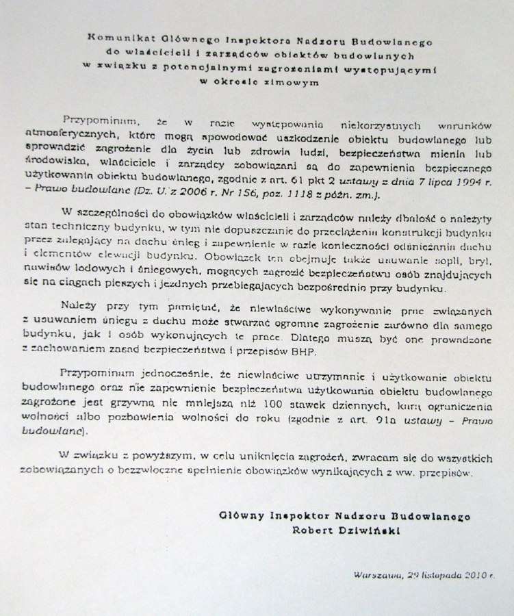 Poniżej Komunikat Głównego Inspektora Nadzoru Budowlanego do właścicieli i Zarządców obiektów budowlanych w związku z potencjalnymi zagrożeniami występującymi w okresie zimowym.