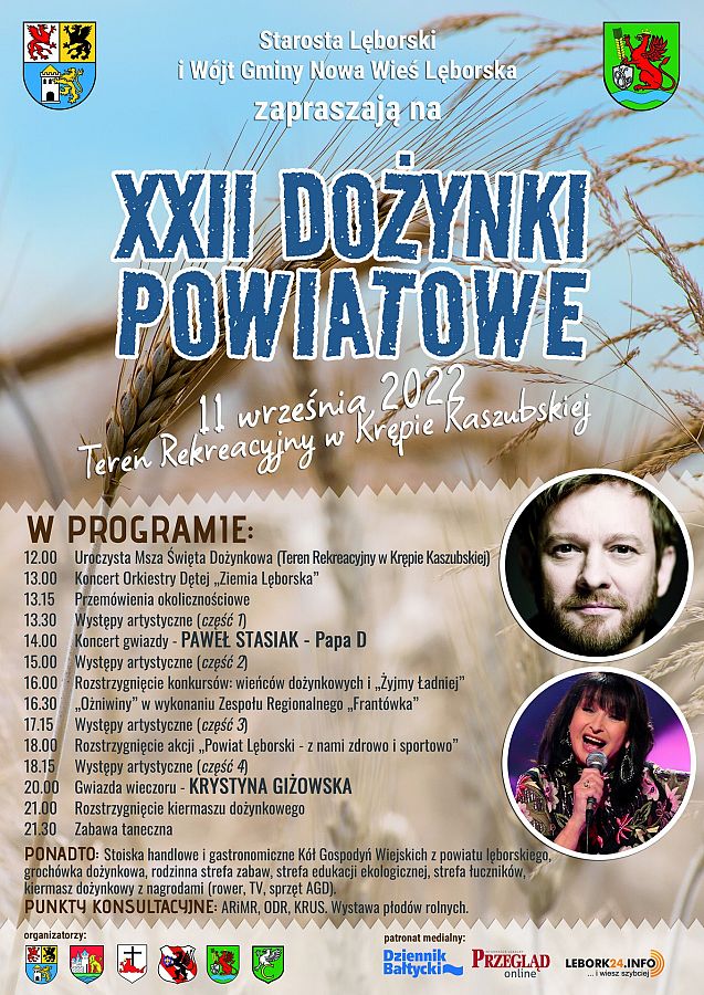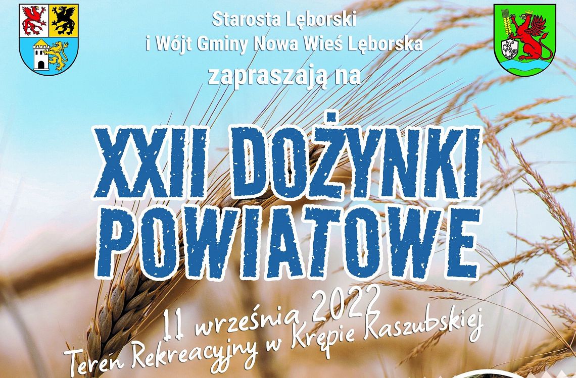 W niedzielę, 11 września 2022 r. na terenie rekreacyjnym w Krępie Kaszubskiej odbędą się XXII Dożynki Powiatowe. Podczas imprezy będzie można obejrzeć występy zespołów artystycznych z gmin Nowa Wieś Lęborska, Wicko, Cewice oraz z Lęborka i Łeby. Ponadto zaplanowano stoiska handlowe i gastronomiczne Kół Gospodyń Wiejskich z powiatu lęborskiego, grochówkę dożynkową oraz wiele innych atrakcji.