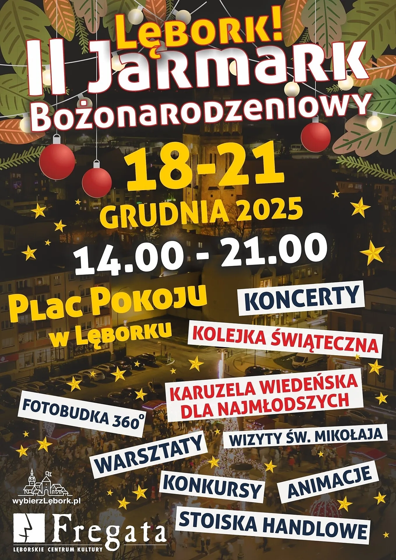 Lęborskie Centrum Kultury „Fregata” zaprasza wszystkich mieszkańców i gości na II Jarmark Bożonarodzeniowy w Lęborku. Od 18 do 21 grudnia 2025 roku na Placu Pokoju czeka na Państwa moc atrakcji, między innymi bezpłatna świąteczna karuzela dla najmłodszych, animacje dla dzieci czy występy artystów na scenie. Zapraszamy również na nowe atrakcje, czyli świąteczną kolejkę dla dzieci i fotobudkę 360 stopni. Nie zabraknie oczywiście wizyty Świętego Mikołaja. W tym roku zwiększamy także liczbę stoisk handlowych, które zaoferują regionalne przysmaki i ciekawe propozycje ozdób i prezentów świątecznych.