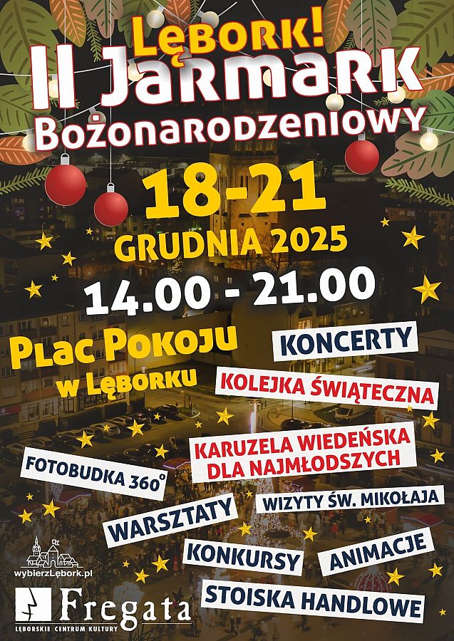 – Przygotowaliśmy bardzo bogaty program kulturalno-artystyczny, który sprawi, że na jarmarku każdy znajdzie coś dla siebie. – zapewnia dyrektor Lęborskiego Centrum Kultury „Fregata” Paweł Piwka. - Będą koncerty, animacje, występy artystyczne, ale też zupełnie nowe atrakcje – m.in. duża kolejka św. Mikołaja oraz świąteczna fotobudka, która pozwoli zabrać ze sobą pamiątkę z jarmarku. Zależało nam na tym, by jarmark był miejscem radości, rodzinnego spotkania i dobrej zabawy.