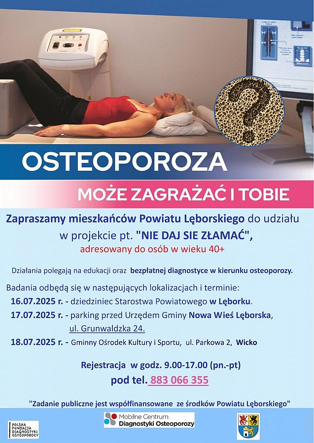 W ramach projektu pn. "Nie daj się złamać” mieszkańcy Powiatu Lęborskiego w wieku 40+ będą mieli okazję zbadać się bezpłatnie w kierunku osteoporozy.