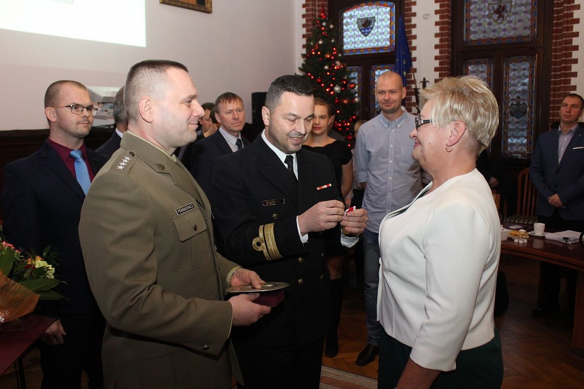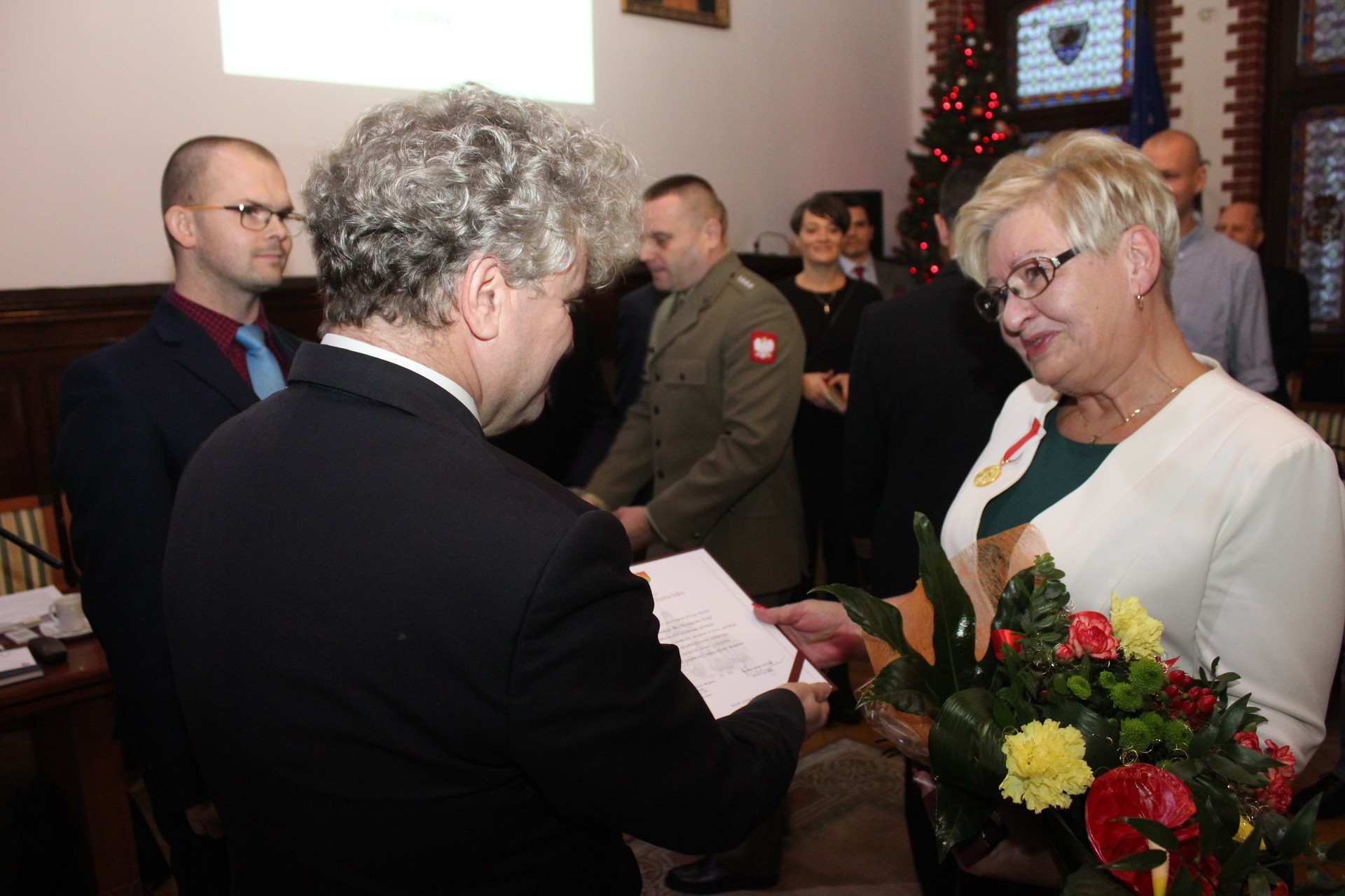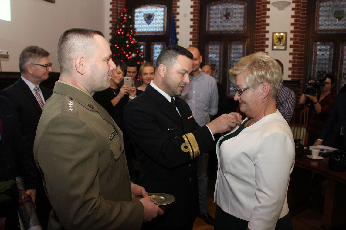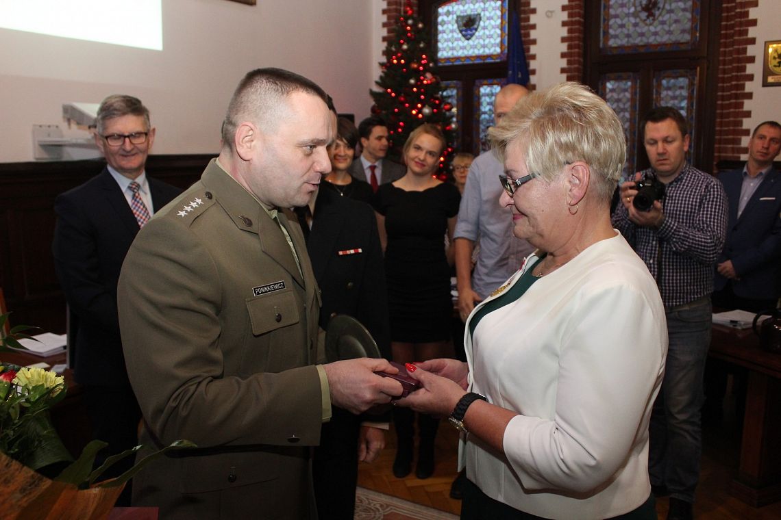 Miła uroczystość miała miejsce przez III Sesją Rady Miejskiej 21 grudnia br. Decyzją Ministra Obrony Narodowej Złoty Medal „Za zasługi dla obronności kraju” odebrała Maria Zawadzka. Medal został ustanowiony przez Sejm ustawą z 21 kwietnia 1966 roku i stanowi uznanie dla osób, które swoją pracą lub działalnością przyczyniły się do rozwoju i umocnienia obronności kraju. Wręcza się go także rodzicom, którzy wychowali dzieci na wzorowych i ofiarnych żołnierzy. Mąż Pani Marii Zawadzkiej oraz dwóje synów i córka służą w wojsku.