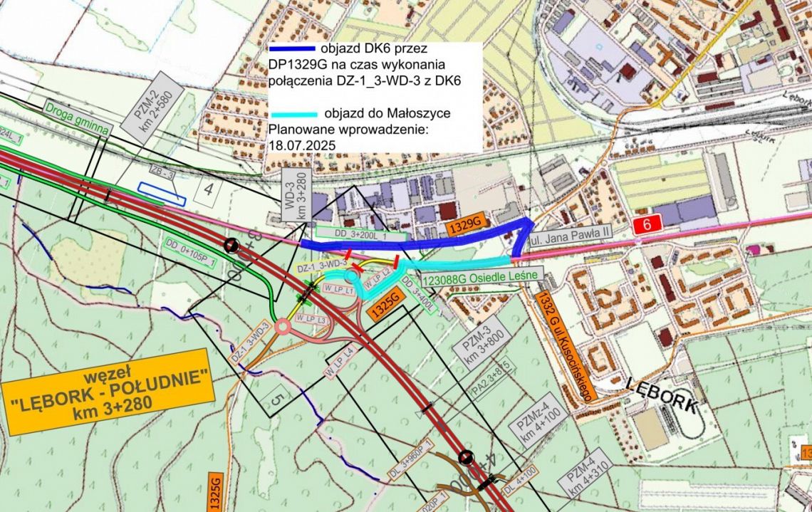Od 18 lipca 2025 r. na około trzy tygodnie planowana jest kolejna, istotna zmiana w organizacji ruchu na odcinku drogi krajowej nr 6, wynikająca z trwającej budowy drogi ekspresowej S6. Wykonane zostanie połączenie nowo wybudowanego węzła Lębork Zachód z istniejącą trasą drogi krajowej DK6. Zjazd z północnego ronda zostanie połączony z drogą krajową łukiem w kierunku wschodnim jako odcinek ciągły, a nie skrzyżowanie jak dotychczas.