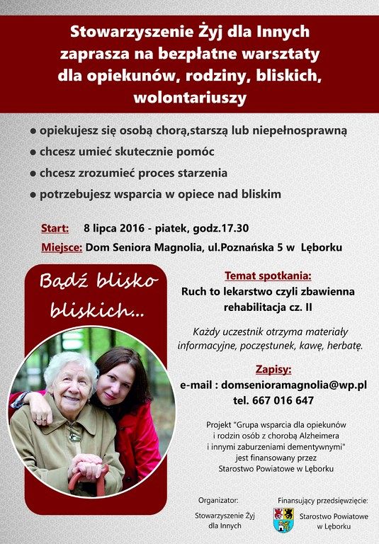 Stowarzyszenie Żyj dla Innych zaprasza na bezpłatne warsztaty dla opiekunów, rodzin, bliskich i wolontariuszy, które odbędą się w piątek 8 lipca o godz. 17.30 w Domu Seniora Magnolia przy ul. Poznańskiej 5. Temat spotkania: Ruch to lekarstwo czyli zbawienna rehabilitacja cz. II.
