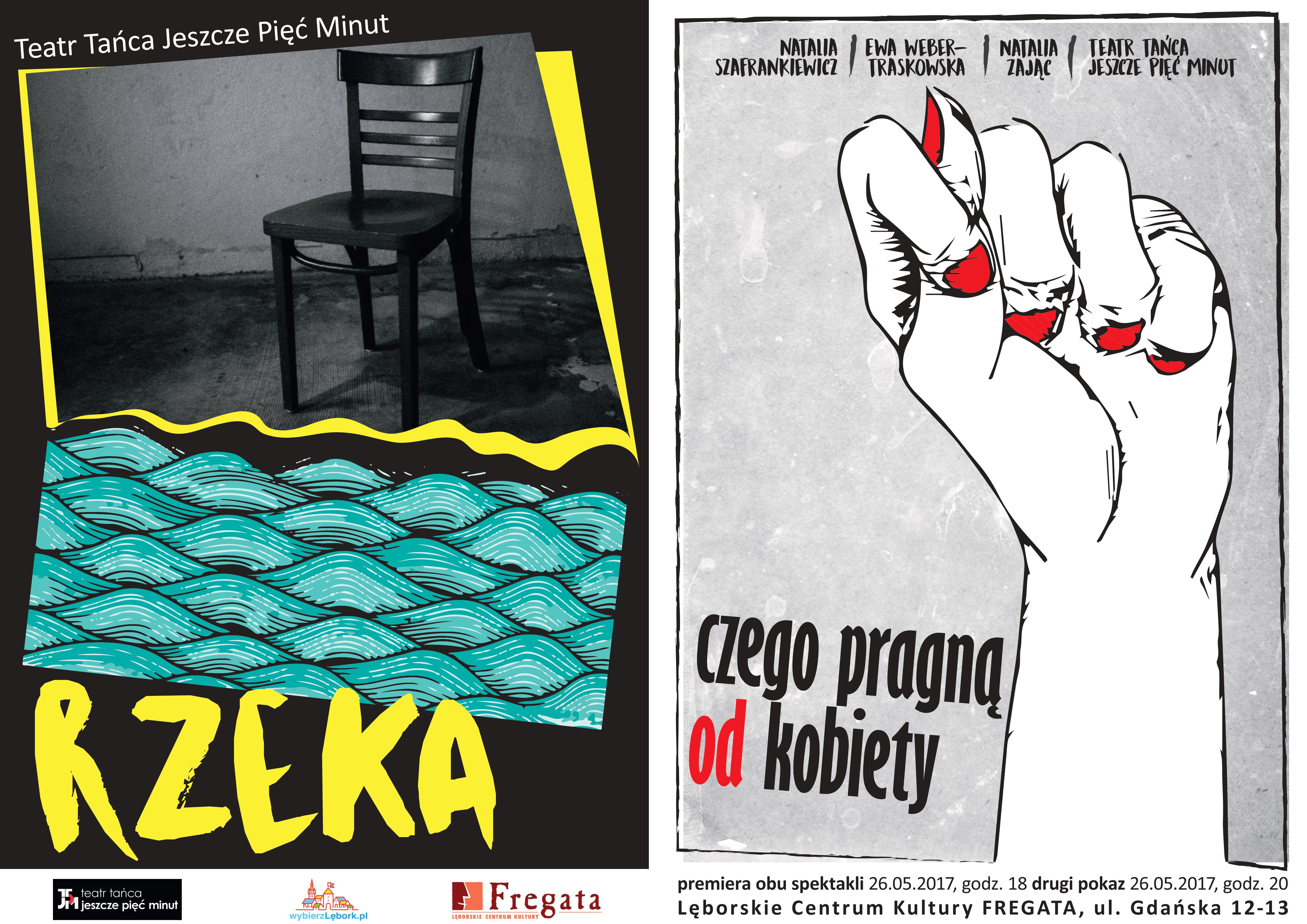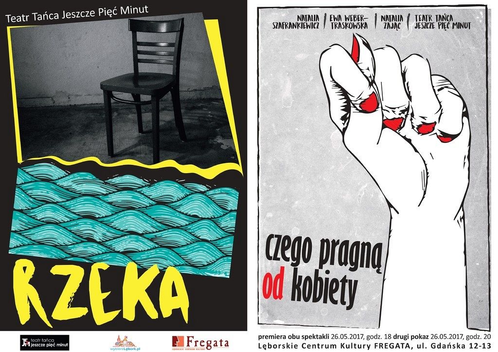 Teatr Tańca Jeszcze 5 Minut i Lęborskie Centrum Kultury „Fregata” zapraszają w piątek 26 maja 2017 roku na wieczór z premierami dwóch spektakli. „Rzeka” i „Czego pragną od kobiety” – te najnowsze produkcje Teatru będzie można obejrzeć w Kinie „Fregata” o godzinie 18. Drugi pokaz obu spektakli o godzinie 20.